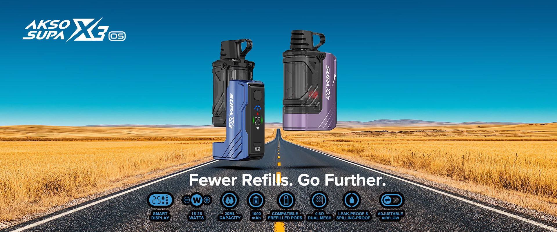 READ MOREAKSO SUPA X3 POD KIT 1. 25K Puff Replaceable Pod 2. 12-22W Variable Wattage Range 3. One-Button Boost Mode 4. Compatible with SUPA X Prefilled and Refillable Pods 5. HD Display of Wattage, Battery, and E-Liquid Levels 6. 1000mAh Rechargeable Battery